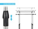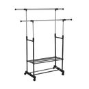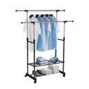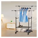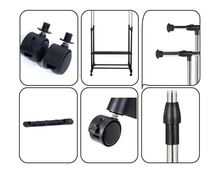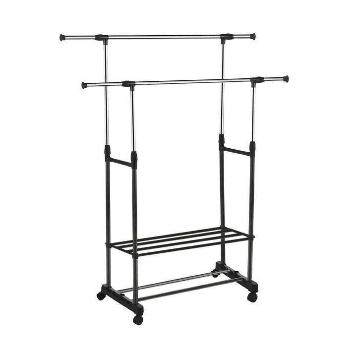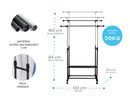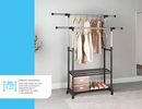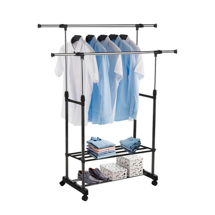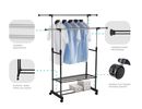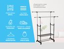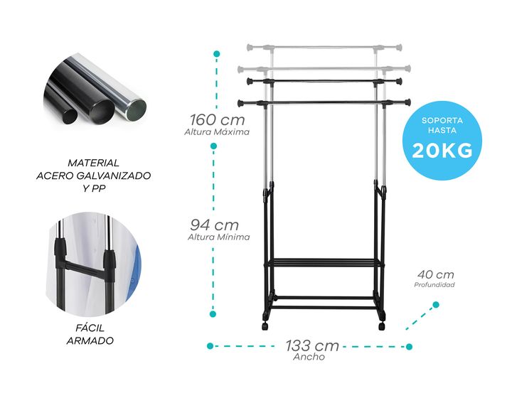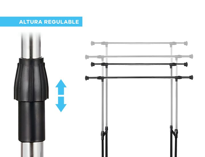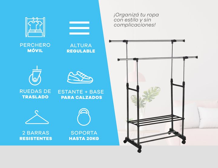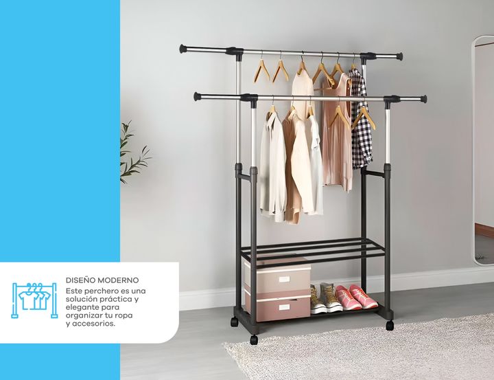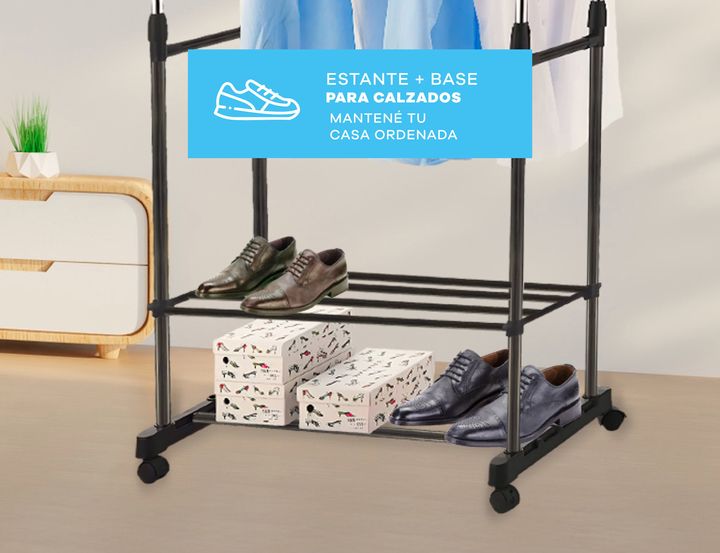 Perchero móvil Importbaires doble barra más estante y base para calzados. Altura regulable Este perchero es una solución práctica y elegante para organizar tu ropa y accesorios. Cuenta con dos barras con altura regulable resistentes para colgar tus prendas, estante intermedio que aumenta su capacida...