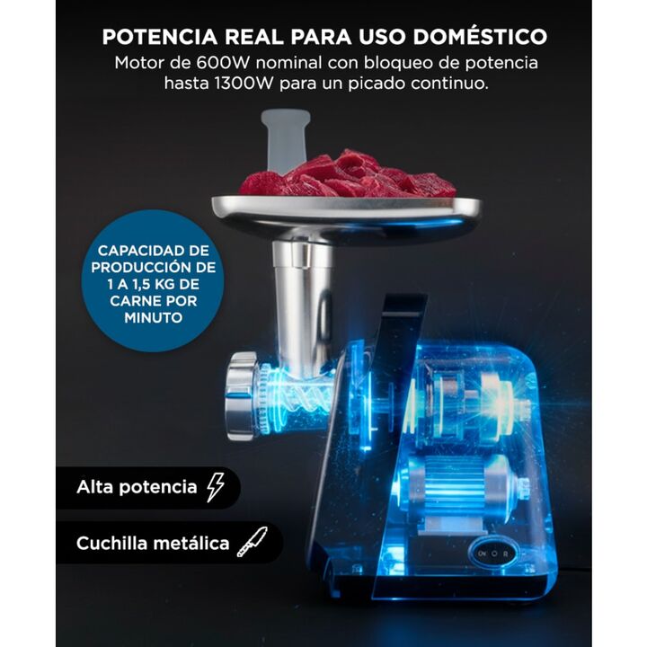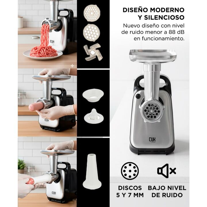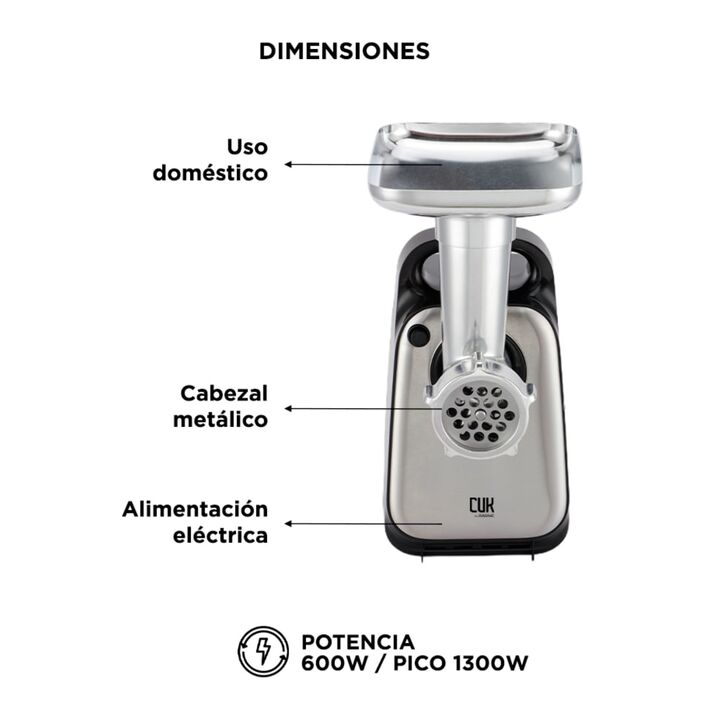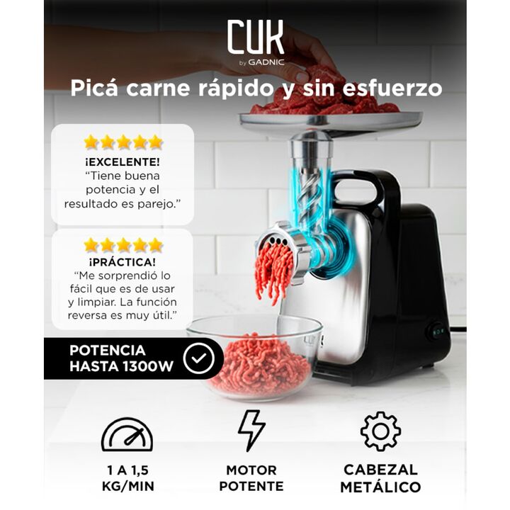 Potencia real para un picado rápido y continuo La picadora de carne eléctrica CUK by Gadnic cuenta con un motor de 600W nominal y bloqueo de potencia de hasta 1300W, ideal para procesar carne de forma eficiente en el uso doméstico diario. Alto rendimiento con excelente capacidad de salida Permite pi...