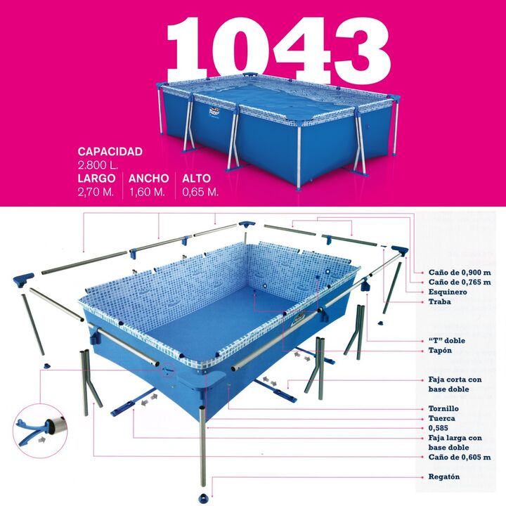 Pileta de lona 1043, estructura metálica inoxidable y esquineros de PVC reforzados. Tamaño 2,70 x 1,60 x 0,65 metros (aprox.) Litros 2.800 (aprox.) Caja 92,0 x 34,5 x 17,0 centímetros (aprox.) Peso 20,700 kilogramos (aprox.) Espacio requerido 3,30 x 2,20 metros (aprox.) Incluye Kit de Reparación y A...