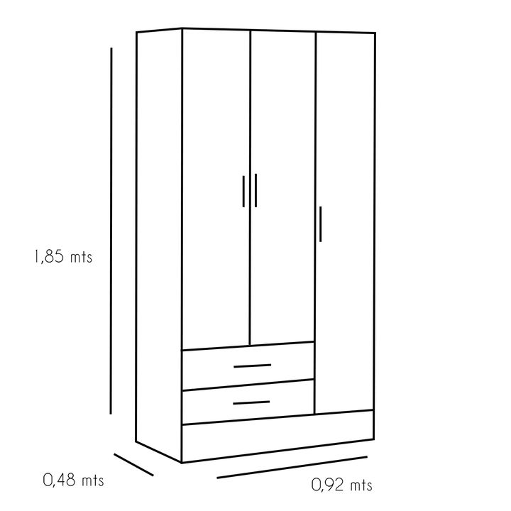 Características Placard 913 es parte de la colección Línea BASE. Posee 2 cajones con correderas metálicas, 3 estantes móviles, 2 estantes fijos y 1 barral para colgar sus prendas. Medidas Largo: 0,92 m | Alto: 1,85 m | Profundidad: 0,48 m Peso y Embalaje Peso: 66 k | Embalado: 1 caja