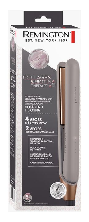 PLANCHA ALISADORA REMINGTON COLLAGEN AND BIOTIN THERAPY 230° MODELO: S31A Plancha tu cabello y dejalo con menos frizz y sin residuos grasos con la plancha alisadora de Collagen & Biotin Therapy™. Con sus placas recubiertas de 4 veces más cerámica *con microacondicionador enriquecido con colágeno y b...