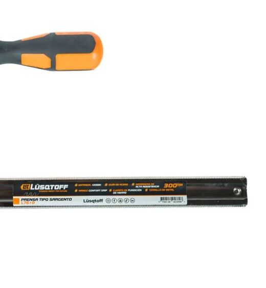 PRENSA SARGENTO PROFESIONAL DE 30CM LÜSQTOFF L7610 DE ALTA RESISTENCIA • Tornillo de metal y profundidad de mordaza 120 mm. • Guía construida en acero de alta resistencia. • Mordazas de alta resistencia con cuerpo de fundición de hierro. • Cómodo mango comfort grip para un mejor agarre. Garantía: 6 ...