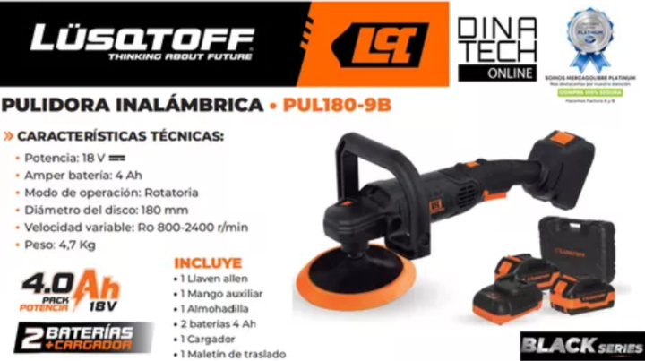 PULIDORA INALÁMBRICA LUSQTOFF PUL180-9B La Pulidora Inalámbrica Lusqtoff Pul180-9b es perfecta tanto para uso hogareño como para profesionales que buscan un equipo eficiente y duradero. ¡Haz que tus proyectos de pulido sean más fáciles y rápidos con esta herramienta de alta calidad! Con la Pulidora ...