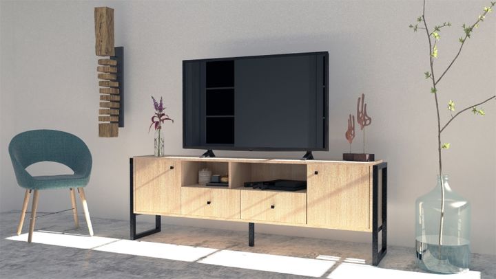 RACK PARA TV STEEL DST05 DST05RN ROBLE NEBRASKA NATURAL DELOS -Rack para TV hasta 65 -2 puertas + 2 cajones -Estructura de hierro negro mate de 1,32 -Cuadro de 3 x 3 cm -Melamina de 15 mm -Guias telescopicas -Medidas (AnxAlxProf) 177 x 60 x 37 cm -Color ROBLE NEBRASKA NATURAL -Modelo STEEL DST05 -Ga...