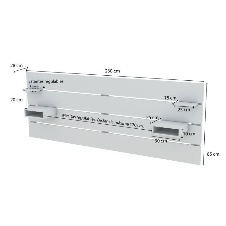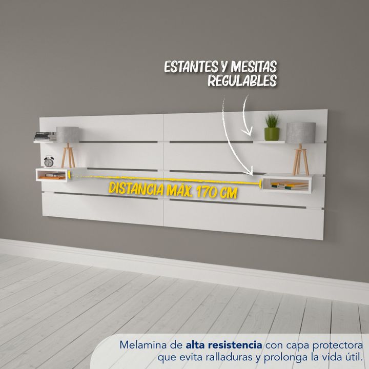 RESPALDO CENTRO ESTANT CON ESTANTES Y MESAS DE LUZ BLANCO MODELO: RC5BL RESPALDO DE CAMA RC5 MELAMINA 230CM X 85CM CENTRO ESTANT DORMITORIO HABITACIÓN SOMMIER CARACTERISTICAS: PESO EMBALAJE: 28 kg DIMENSIONES EMBALAJE: 118,5 × 9,5 × 40,5 cm COLOR: Blanco MATERIAL: Melamina ALTO DEL MUEBLE (CM): 85 A...