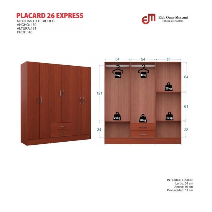 ROPERO PLACARD 6 PUERTAS MOSCONI EXPRESS 2 CAJONES 55985 COLOR CAOBA