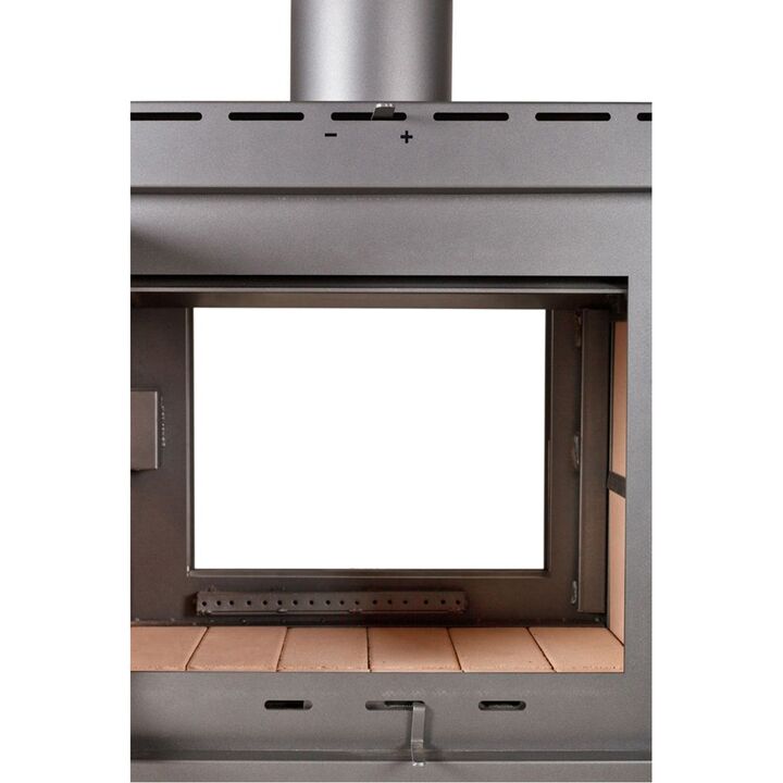 Estufa con doble frente a leña de gran tamaño de 18.000 kcal/hr. Para superficies de 140 a 200 m2. Recubierto en todo el interior con refractarios, posee dos cámaras de combustión, donde se queman todos los gases (no emite humo ni olor), su sistema de doble combustión logra un alto rendimiento de bi...