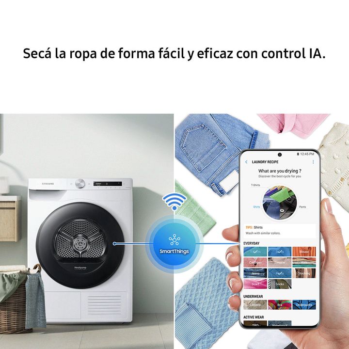 9 Kg | CONTROL IA | TECNOLOGIA HEATPUMP | DIGITAL INVERTER | SECADO RÁPIDO 35 SECADO INTELIGENTE Secá la ropa de forma fácil y eficaz con control IA. Esta tecnología personaliza el secado recordando tus hábitos, sugiriendo ciclos y mostrando información puntual. Una SmartThings App proporciona conse...