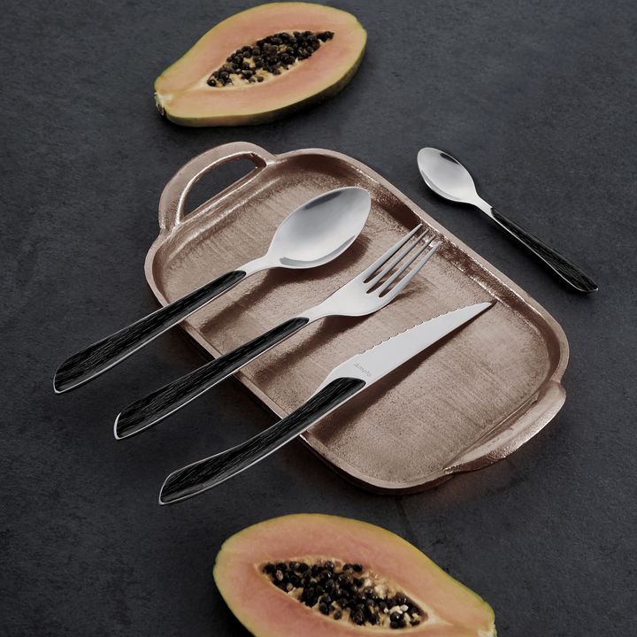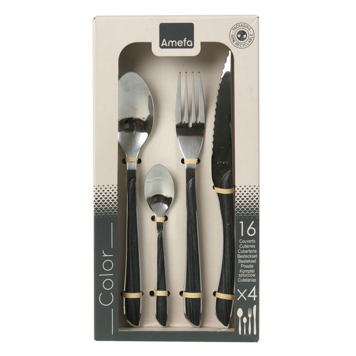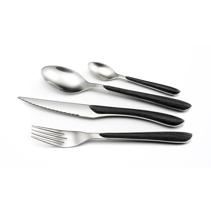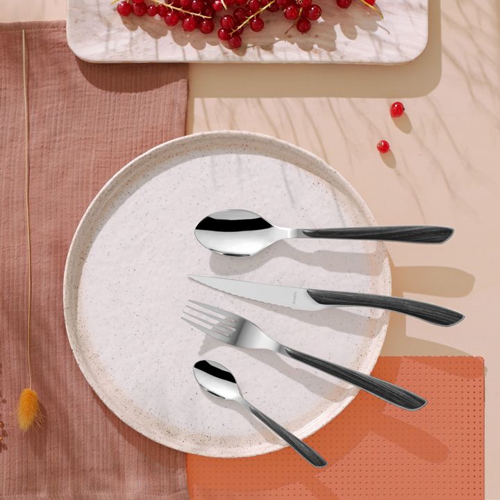 Set de Cubiertos marca Amefa , linea Eclat Nature - Juego de cubiertos 18/0 con mango tipo madera, color marrón o gris. Acero: INOX 18/0 (AISI 430) para la mayoría de las piezas y 13/c (AISI 420) templado para el cuchillo Espesor: 2,0 mm Terminación : Brillante Compuesto por 16 piezas, servicio para...