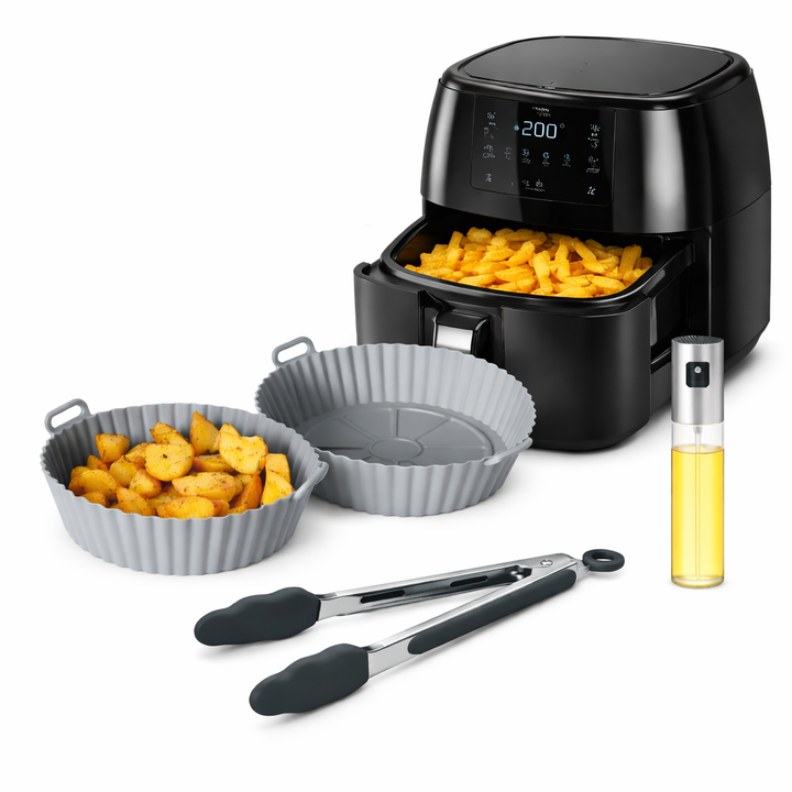 Set de cocina completo ideal para freidora de aire que incluye 2 moldes de silicona, aceitera en spray y pinza. Los moldes están fabricados en silicona de grado alimenticio, libres de BPA, antiadherentes y resistentes a altas temperaturas de hasta 250 °C, lo que los hace aptos para freidoras eléctri...