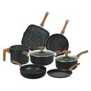 Bateria linea ETHNO , con antiadherente ceramica en su interior. Material : Aluminio con antiadherente ceramico en su interior. El mango es de baquelita simil madera , tacto soft touch siliconado . El interior tiene antiadherente ceramico ( pintitas blancas) , el exterior es liso. Compuesto por : 1-...