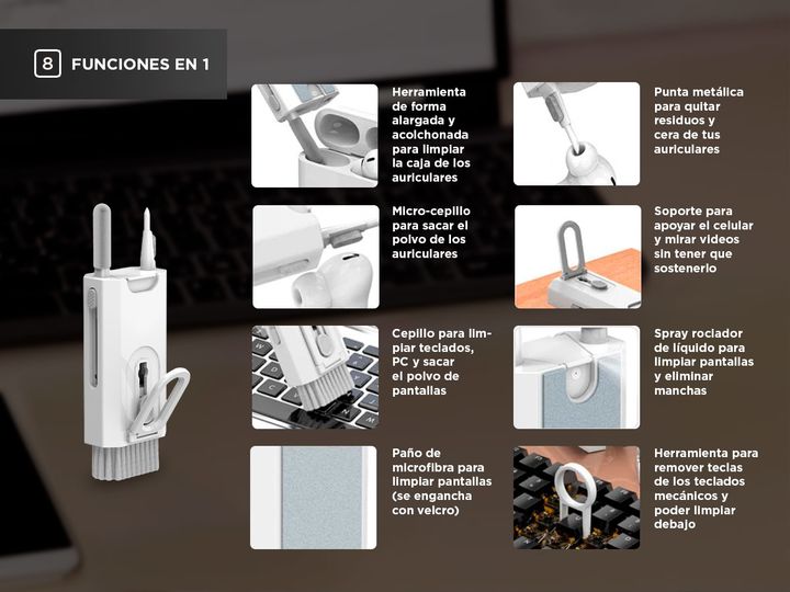 ¿Queres mantener tus dispositivos electrónicos limpios y en buen estado? Entonces, el Kit de Limpieza 8 en 1 es la solución perfecta para vos. Este kit cuenta con ocho herramientas en una sola, lo que lo hace muy práctico y conveniente. El kit incluye un paño de microfibra para limpiar pantallas, un...