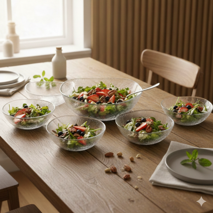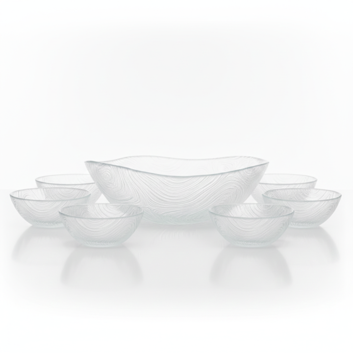 Set de Ensaladera + 6 Bowls Copetineros de Vidrio Labrado Dale un toque de distinción a tu mesa con este exclusivo set de bowls! Este combo de 7 piezas combina diseño artístico y funcionalidad, ideal para servir desde grandes ensaladas hasta postres individuales, salsas o snacks. Cada pieza cuenta c...
