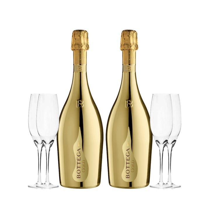 Set Espumante Prosecco Bottega Gold x 2 y 4 Copas Con Estuche