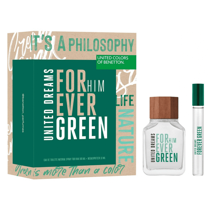 Set contiene EDT 100 Ml + Travel Size 10 Ml Benetton Perfumes lanza Forever Green, un claro homenaje al verde que para United Colors of Benetton es más que un color, es una filosofía. Este lanzamiento es una fragancia vegana, tiene 98% de ingredientes de origen natural y +97% de ingredientes biodegr...