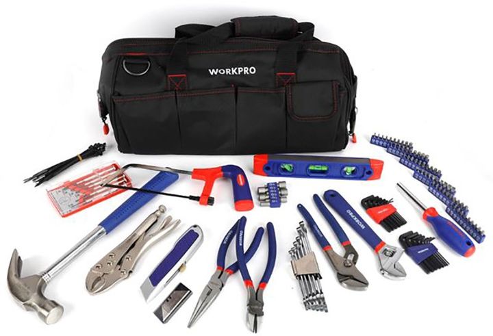 JUEGO HERRAMIENTAS 155 PIEZAS W009036NTWORKPRO # 1 Bolso de herramientas con cierre de16 # 1 Nivel torpedo plástico de 9 # Juego de llaves hexagonales métricas de 8 piezas # Juego de llaves hexagonales en pulgadas de 8 piezas # 1 Pieza soporte magnético para puntas # 60 puntas CR-V de 1 # 6 Pieza...