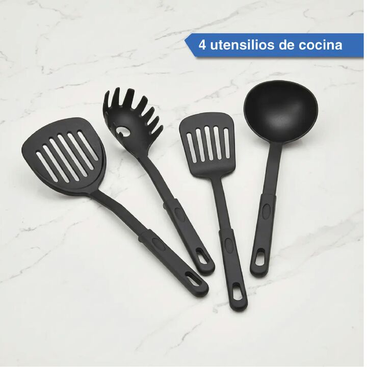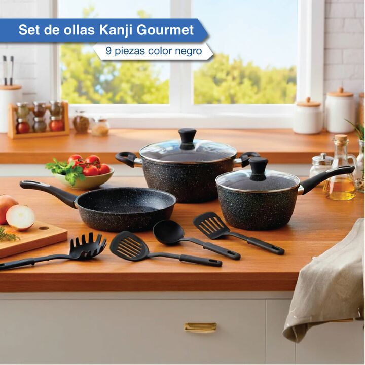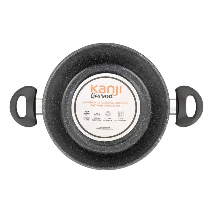 Modelo: JN-C001 Marca: KANJI - Fabricadas en acero al carbono con diseño de mármol negro - Revestimiento antiadherente - Mangos suaves al tacto - Aptas para todo tipo de cocinas - Aptas para lavavajillas - Cacerola de 24 cm con tapa - Cacerola de 20 cm con tapa - Sartén de 24 cm - 4 utensilios de co...
