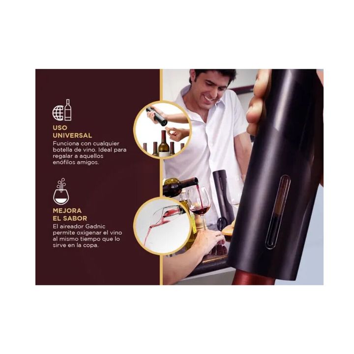 Este Set funciona con cualquier botella de vino y es ideal para regalar en ocasiones especiales a aquellos amantes del vino. La forma más fácil de enriquecer el aroma, suavizar los taninos y mejorar el sabor del vino. El aireador Gadnic permite oxigenar el vino al mismo tiempo que lo sirve en la cop...