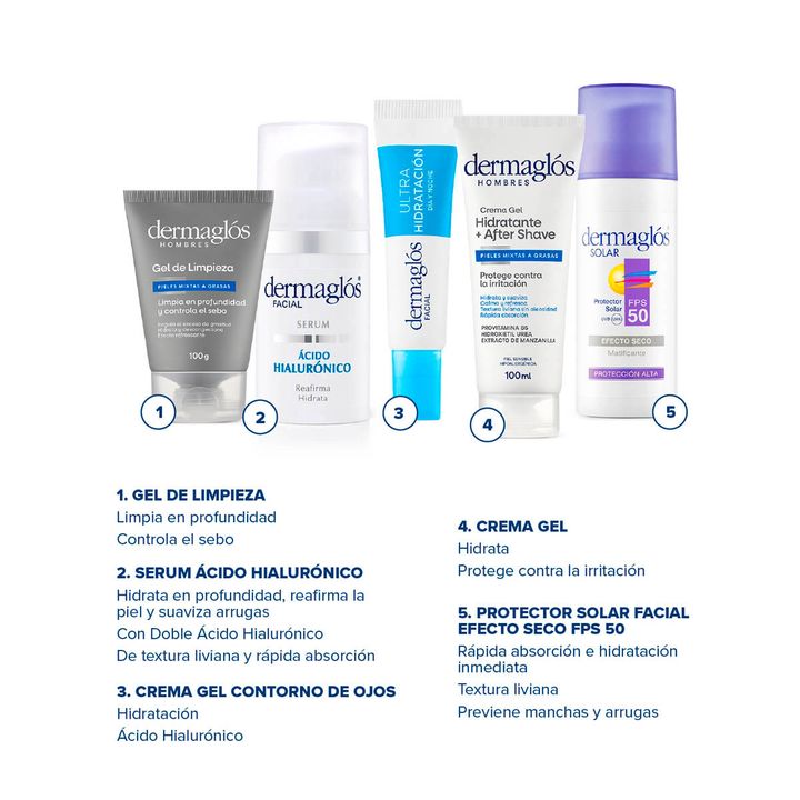 El Kit Rutina Facial Completa Dermaglós Hombre incluye los productos: After Shave Dermaglós Hombre: Este producto es ideal para aplicar después del afeitado. Ayuda a calmar y suavizar la piel, evitando irritaciones y rojeces causadas por el afeitado. Gel de Limpieza Facial Dermaglós Hombre: Un gel d...