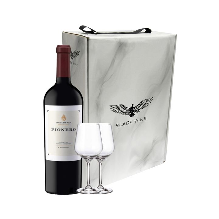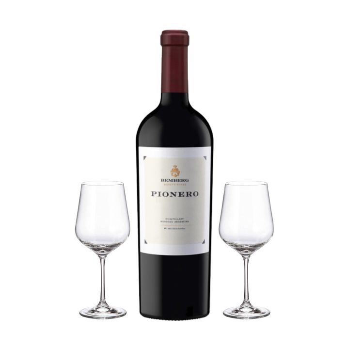 Set Vino Tinto Bemberg Pionero Blend y 2 Copas y Estuche