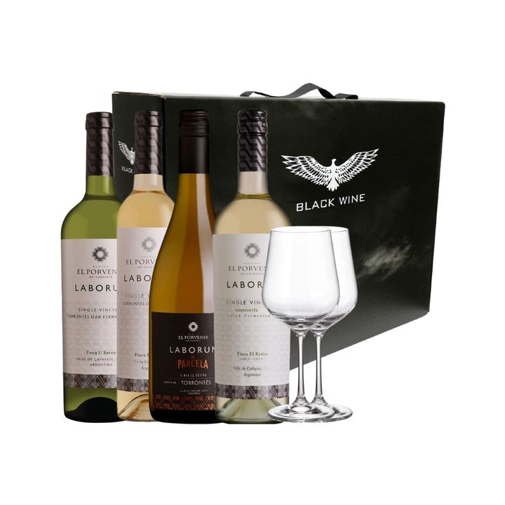 Set Vinos Blancos Degustacion Laborum Torrontes Seleccion x 4 y 2 Copas Con Estuche