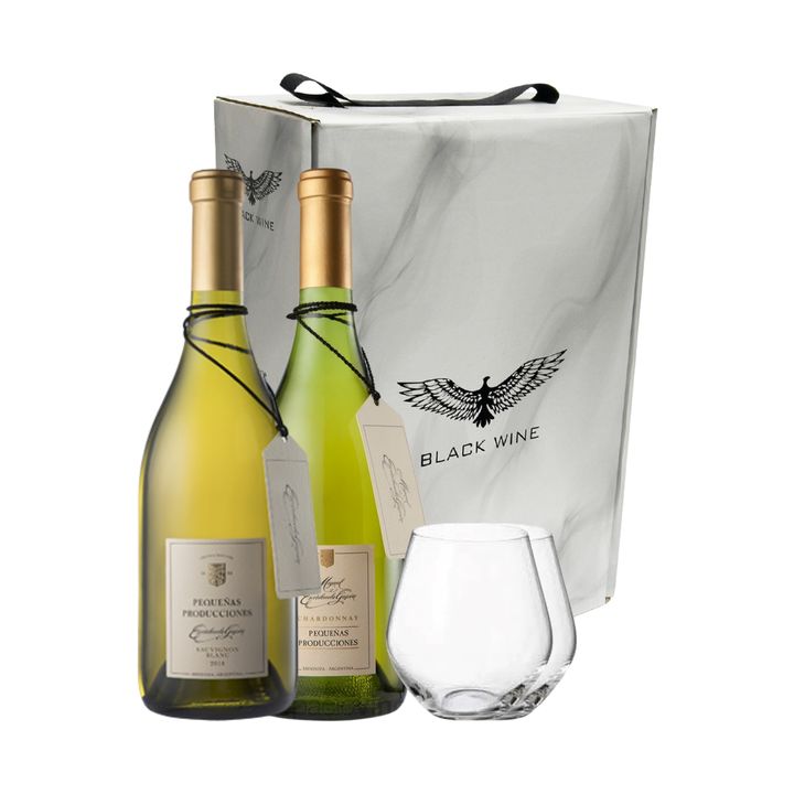 Set Vinos Blancos Pequeñas Producciones x 2 y 2 Copas Sin Pie Con Estuche