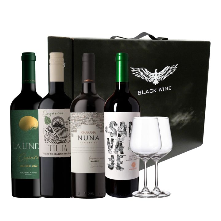 Set Vinos Tintos Malbec Organicos Seleccion x 4 y 2 Copas Con Estuche