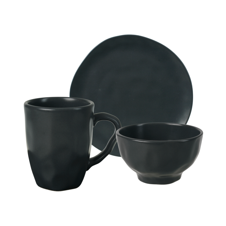 Set de vajilla modelo Organic compuesto por 12 piezas. Material: Cerámica esmaltada de alta resistencia. Espesor aproximado : 4 mm Set compuesto por : - 4 unidades de Plato postre 20 cm. Cerámica Irregular Organic Gris Mate . Medidas : Diamtero : 20 cm / Alto: 2 cm. - 4 unidades de bowl de 14 cm / A...