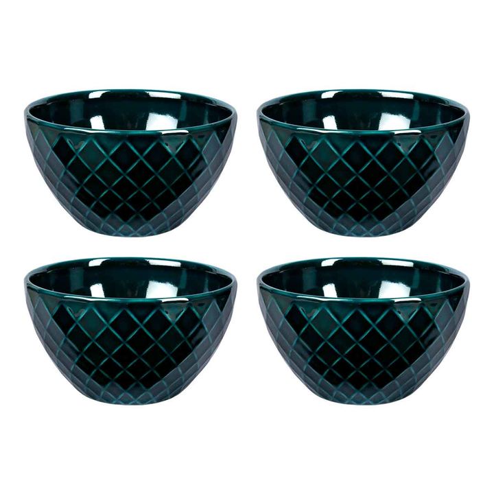 Set x 4 unidades Bowl Compotera Recipiente Cerámica - Diseño: Rombos Facetados Envejecido - Color: Verde -Altura: 7,5 cm -Diametro superior: 13 cm -Diámetro inferior: 7 cm -Capacidad: 580 ml -Material: Cerámica -Cantidad de piezas por set: 4 -Origen: Turquía -Marca: Aston