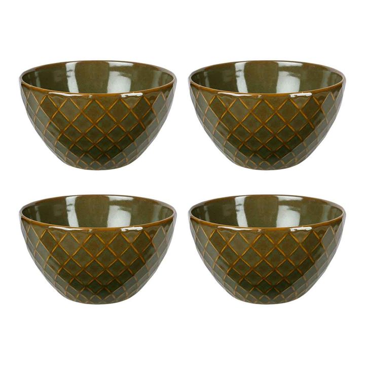 Set x 4 unidades Bowl Compotera Recipiente Cerámica - Diseño: Rombos Facetados Envejecido - Color: Mostaza -Altura: 7,5 cm -Diametro superior: 13 cm -Diámetro inferior: 7 cm -Capacidad: 580 ml -Material: Cerámica -Cantidad de piezas por set: 4 -Origen: Turquía -Marca: Aston