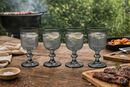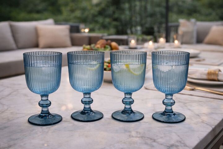 Set x 4 copas labradas en color o transparente de vidrio con pie. Medidas : Altura : 16 cm Diametro de la boca : 9 cm Diametro de la base : 7,3 cm Capacidad : 365 ml Diseño : Moderno , versatil y elegante Perfecto para uso diario u ocaciones especiales, facil de combinar con todo tipo de vajilla o e...