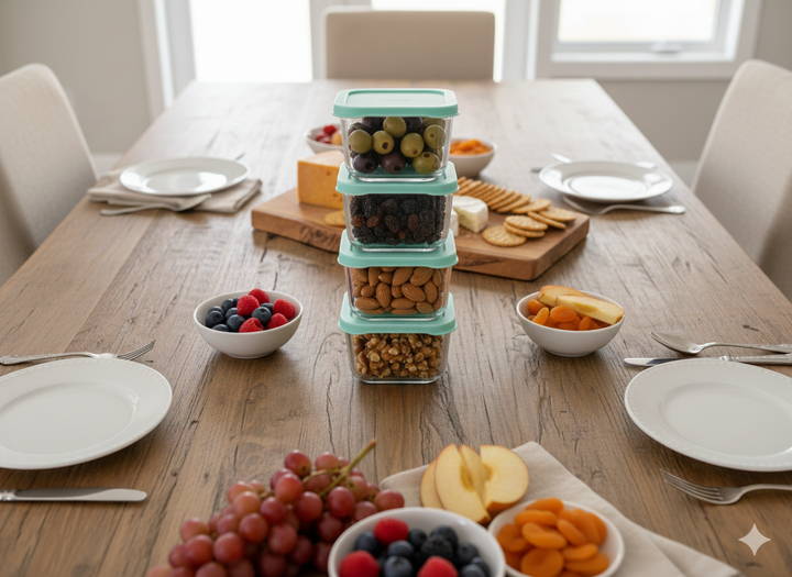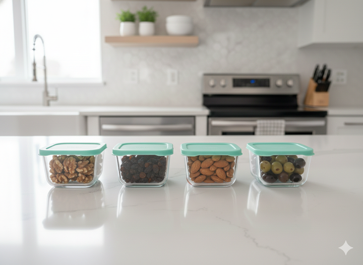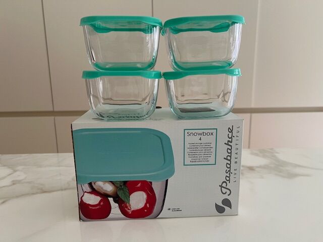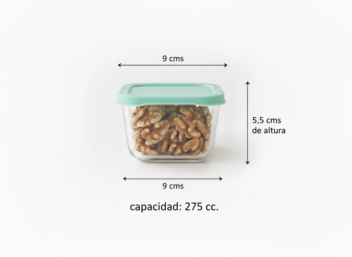 Set x 4 unidades de Contenedor Hermético Pasabahce Snowbox 275 cc Vidrio con Tapa. Material: Vidrio sodocálcico (Soda Lime Glass) Capacidad: 275 cc (9 1/4 oz) Medidas: 90 mm x 90 mm (≈ 9 x 9 cm). Altura : 5,5 cms Ideal para guardar o transportar productos pequeños como : nueces, aceitunas , pasas de...