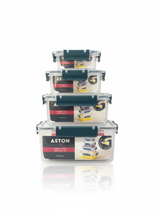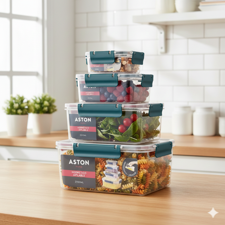 Set x4 Herméticos Rectangulares Aston - Calidad Premium ¡Organizá tu cocina con estilo y seguridad! Este set de 4 contenedores es la solución ideal para conservar tus alimentos frescos por más tiempo. Gracias a su diseño apilable y hermético, optimizás espacio en tu heladera o alacena sin riesgos de...
