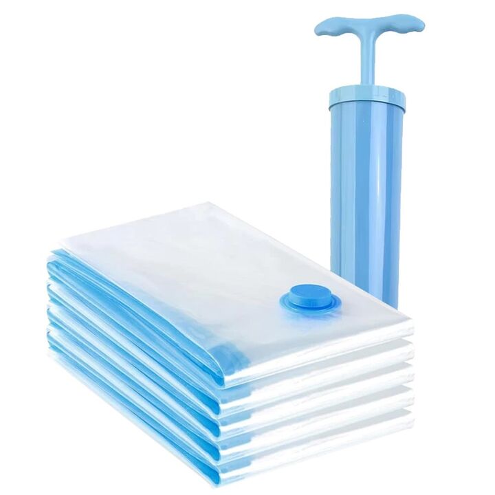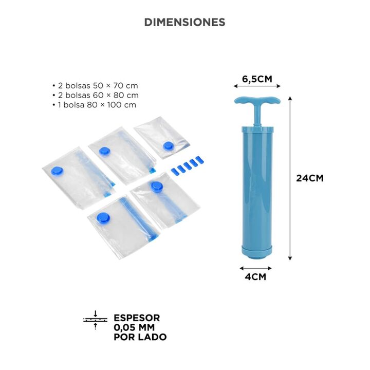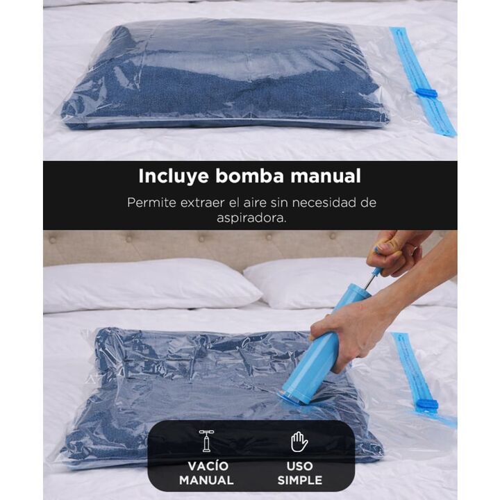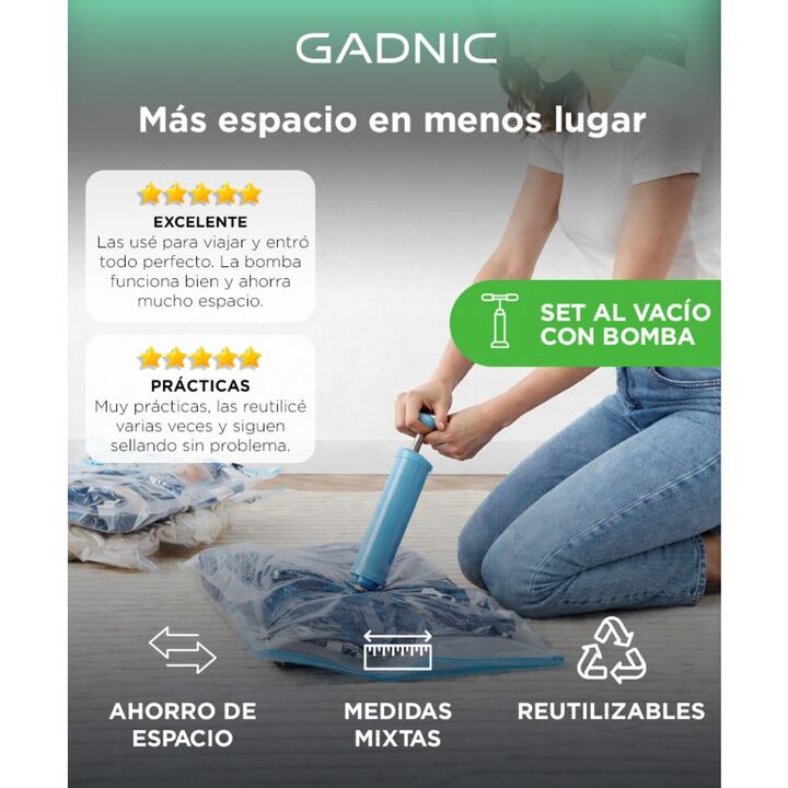 Set completo para ahorro de espacio El set de Bolsas al Vacío Gadnic BOLVAC06 permite reducir el volumen de ropa, acolchados y textiles de forma simple y eficiente. Incluye bomba manual para vacío No necesitás aspiradora. La bomba incluida extrae el aire fácilmente y permite usar las bolsas en cualq...