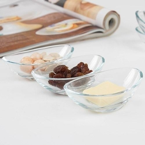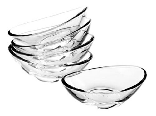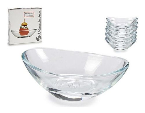 Set compuesto por 6 piezas de platito dip en vidrio. Medidas : diametro boca 9 cms, altura parte alta 6 cms, parte baja 3,5 cms. Caja de regalo x 6 unidades. Ideal para acompañar en la mesa : picadas, nueces, limon, queso, etc Sirve para soja y salsitas. Pasabahce