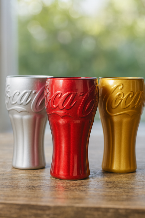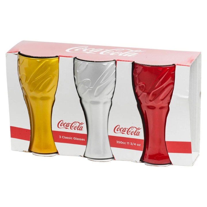 Set compuesto x 9 vasos de Coca Cola de color metalizado : rojo , dorado y plateado. SODALIME GLASS : Estan eleborados por alta calidad de vidrio Acabado metalizado con efecto brillante , que resulta el relieve del logo COCA COLA y le otorga un aspecto moderno y sofisticado. Brillo intenso que resal...