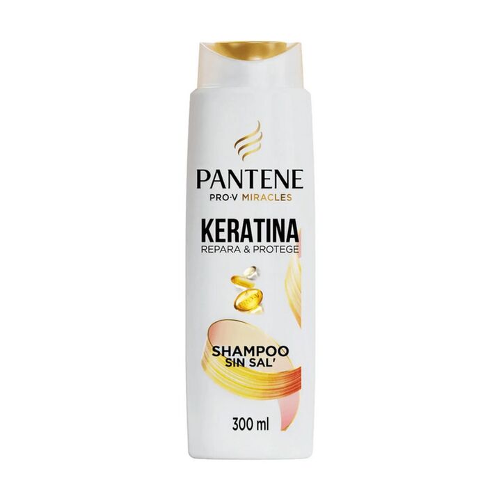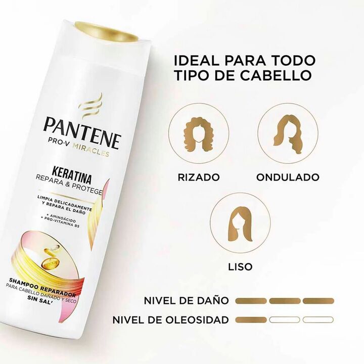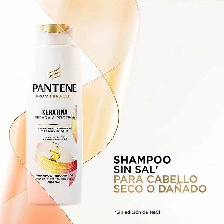 ¿El uso constante de herramientas de calor ha dejado tu cabello dañado, seco y sin vida? Introduce el Shampoo Pantene Keratina Repara y Protege, una colección libre de sal* con una fórmula enriquecida con Keratina, Aminoácidos y Pro Vitamina B5. Este shampoo sin sal* ni aceites minerales limpia suav...