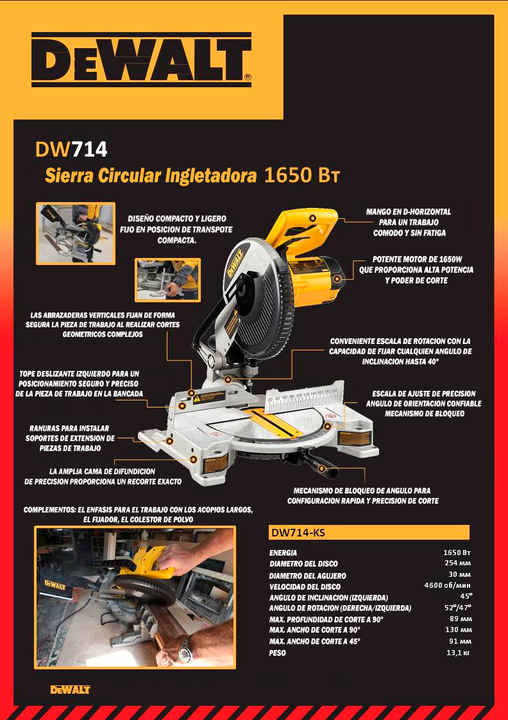 Sierra ingletadora 10 1650 w - DeWalt Modelo: DW714-AR Características: • Potencia: 1,650 W • Velocidad sin carga: 4,600 rpm • Diámetro del disco: 10 • Altura máxima De Corte 90° 89 mm • Ancho máximo De Corte 90° 130 mm • Tamaño del eje: 1 / 1/2 • Peso de la herramienta: 13.1 Kg. • 1650 W con rodami...