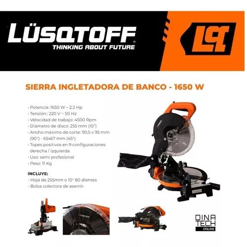 SIERRA INGLETADORA LUSQTOFF 1650W 2.2 HP 10 PULGADAS 250MM LQI-1650 La sierra Lüsqtoff LQI-1650 es la solución para realizar cortes con precisión y velocidad de forma simple y sencilla. Es excelente para equipar un taller o una carpintería, ya sea profesional o amateur. • Su disco de 250mm posibilit...