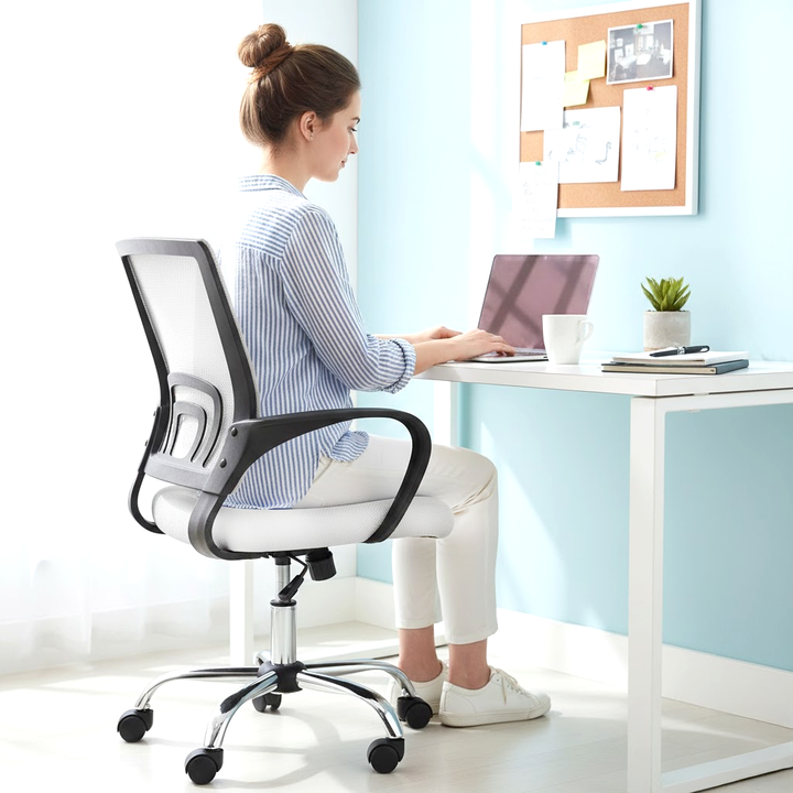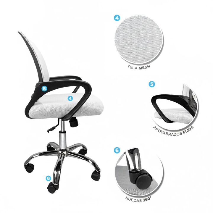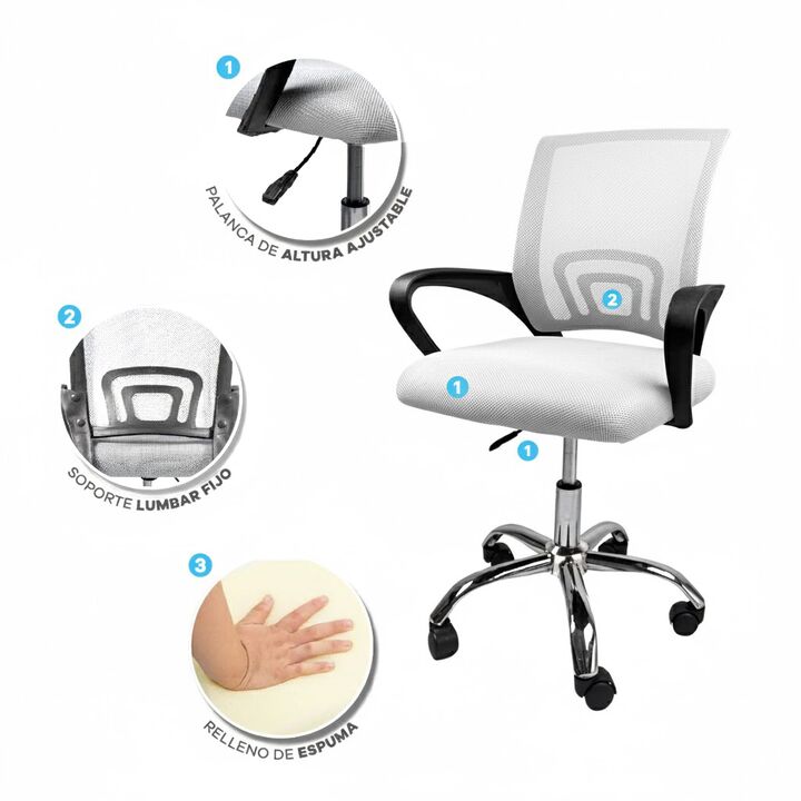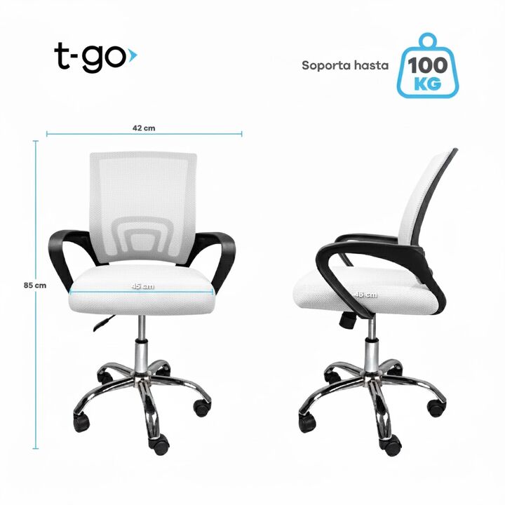 SILLA T-GO DE OFICINA CON SOPORTE LUMBAR FIJO -Apoya brazos fijos acolchonados reforzados -Recubierta de tela mesh respirable -Ergonómica -Construida sobre estructura metálica -Espuma de alta densidad recubierta en cuero ecológico -5 Ruedas de 2 pulgadas supersilenciosas -Mecanismo de balanceo -Dobl...