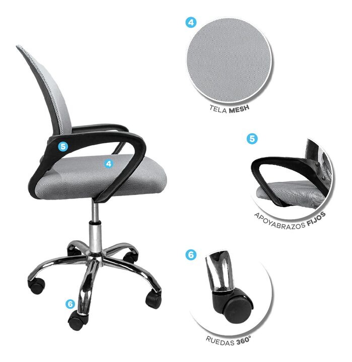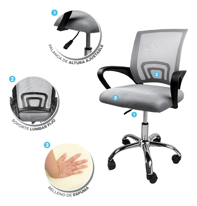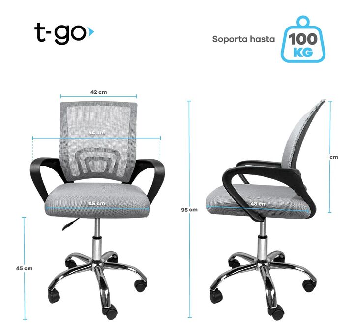 SILLA T-GO DE OFICINA CON SOPORTE LUMBAR FIJO -Apoya brazos fijos acolchonados reforzados -Recubierta de tela mesh respirable -Ergonómica -Construida sobre estructura metálica -Espuma de alta densidad recubierta en cuero ecológico -5 Ruedas de 2 pulgadas supersilenciosas -Mecanismo de balanceo -Dobl...