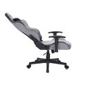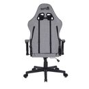 Silla gamer de estilo ergonómico con tapizado en tela negra, respaldo alto reclinable y cojines lumbar y cervical. Su asiento es regulable en altura, tiene apoyabrazos ajustables y ruedas para fácil movilidad. Ideal para largas sesiones de juego o trabajo cuidando la postura.