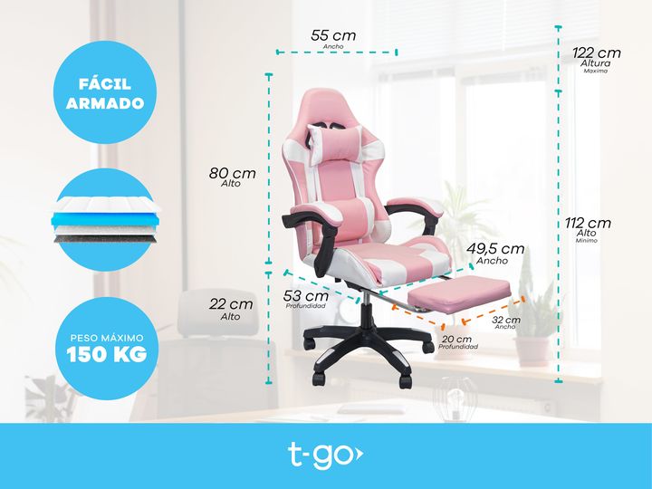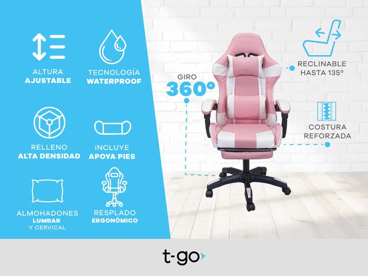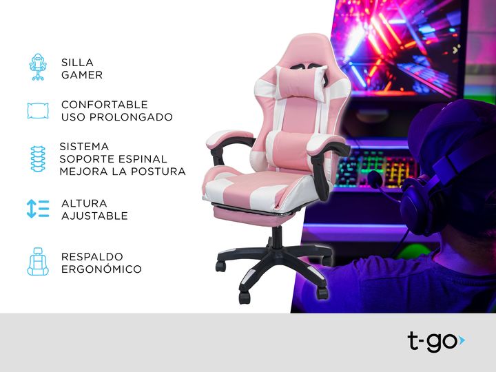 SILLA GAMER T-GO RECLINABLE CON APOYA PIES Esta silla ergonómica está pensada para largas sesiones de gaming o trabajo desde casa. Su diseño con soporte lumbar cuida tu postura y reduce la tensión en la espalda, mientras que su apoya pies retráctil te permite encontrar la posición ideal para relajar...