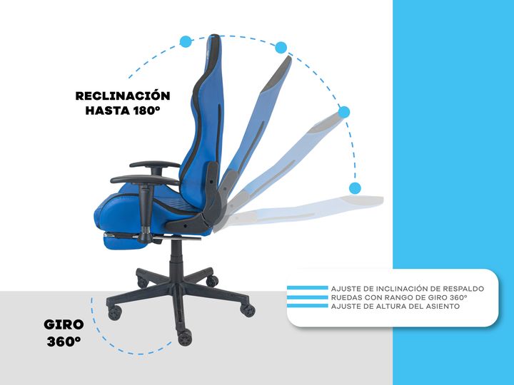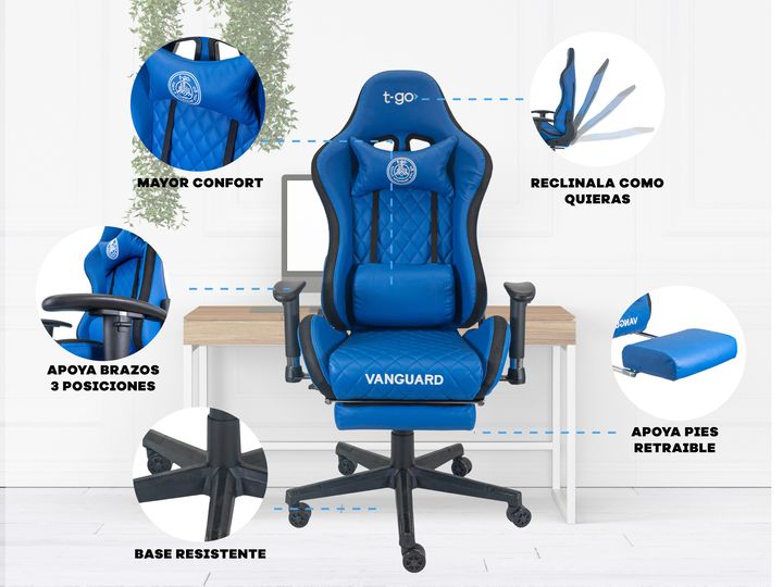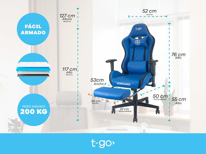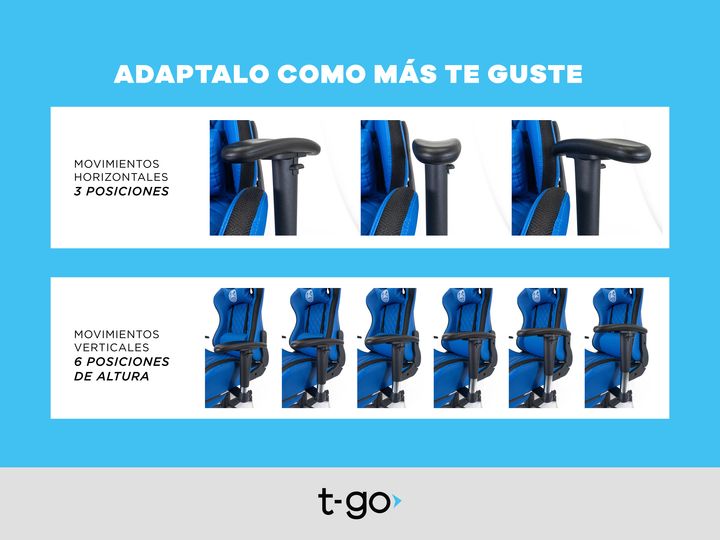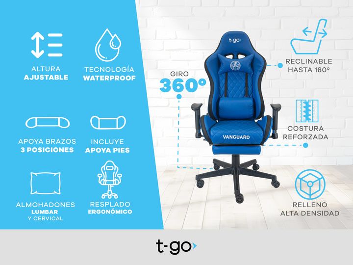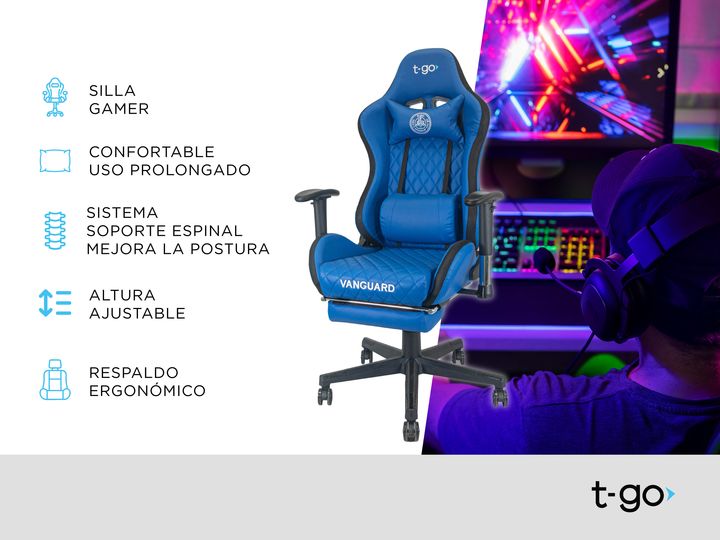SILLA GAMER T-GO RECLINABLE CON APOYA PIES Y TAPIZADO PREMIUM Comodidad Ergonómica y Personalizable Diseñada pensando en largas horas de uso, esta silla cuenta con un soporte lumbar fijo con acolchado extra, que mejora tu postura y reduce la tensión en la espalda. Su innovador sistema de apoya brazo...