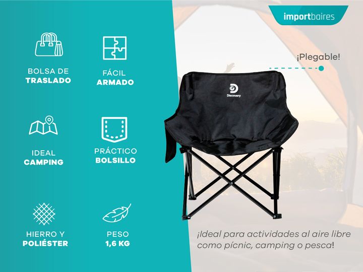 Disfrutá de la comodidad en cualquier aventura con la Silla de Camping Discovery. Ideal para camping, pesca, pícnic o cualquier actividad al aire libre, es fácil de transportar, resistente y perfecta para relajarte donde quieras. Liviana y fácil de transportar, soporta hasta 100 kilos sin perder com...