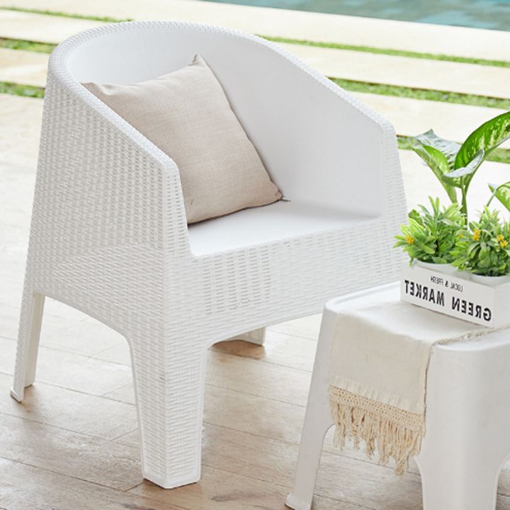 Diferente a todo lo que hay en el mercado. Podes ver atraves de las fibras como en el rattan orgánico. Fabricado con plástico compuesto virgen 100%. Medidas: Alto total: 80 cm Alto al asiento: 45 cm Ancho: 57 cm Profundidad: 60cm Posee una manija para su facil agarre.