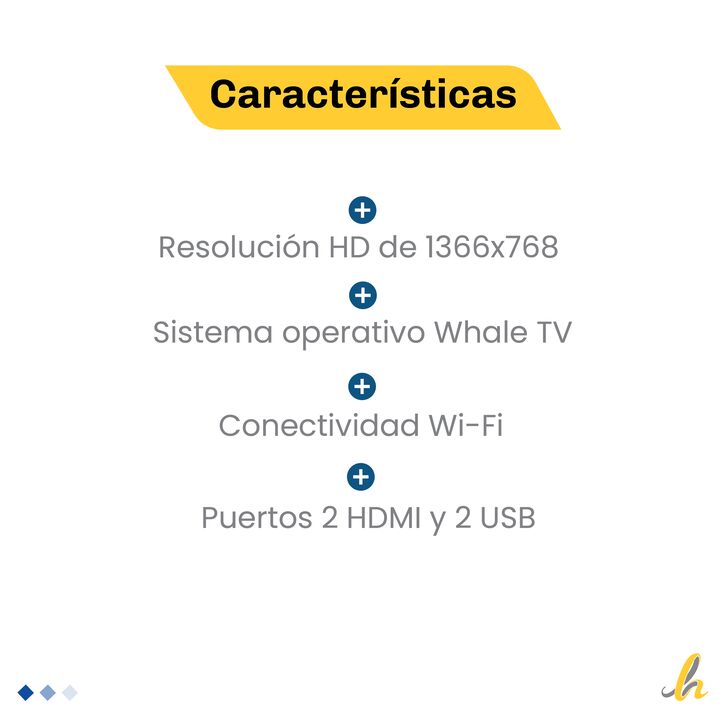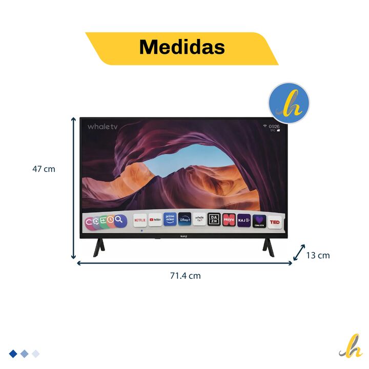 Modelo: KJ-32MT005-2W Marca: KANJI - Resolución HD de 1366x768 - Tecnología LED - Sistema operativo Whale TV - Permite acceder a: Netflix, YouTube, Prime Video, Disney+, y más. - Conectividad Wi-Fi - Puertos 2 HDMI y 2 USB - Cantidad de Parlantes: 2. MEDIDAS: Alto: 47 cm Ancho: 71.4 cm Profundidad: ...