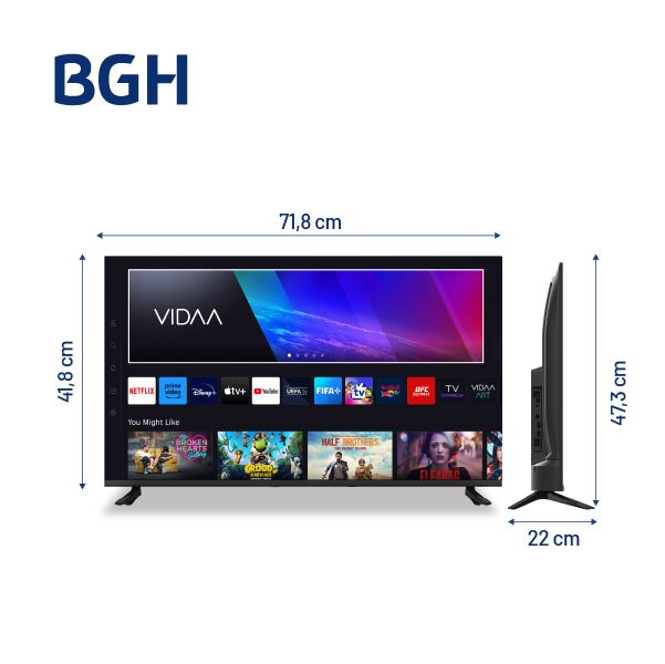 Smart TV VIDAA U6 – HD Frameless Una experiencia más amigable e intuitiva Con VIDAA U6, disfrutá de una interfaz personalizable, rápida y sencilla, pensada para que encuentres tus aplicaciones y contenidos favoritos sin complicaciones. Todo el entretenimiento en un solo lugar Accedé a Netflix, Prime...