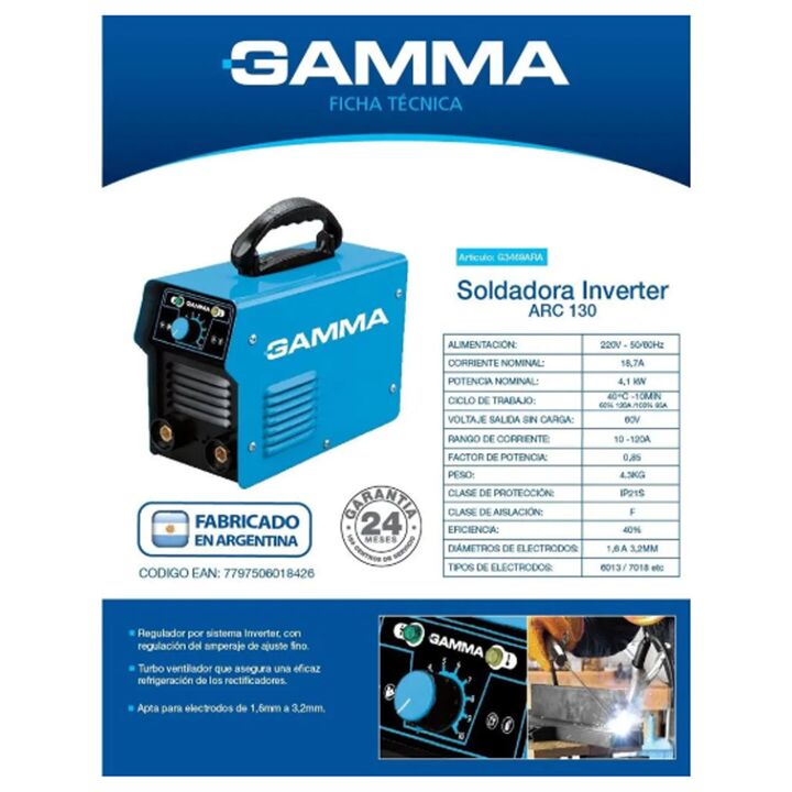 Regulador por sistema inverter, con regulación del amperaje de ajuste fino. Turbo ventilador que asegura una eficaz refrigeración de los rectifiadores. Provista con cables y pinza por electrodo. Apta para electrodos de 1,6 a 3,2 mm. Corriente nominal: 18,7A Potencia nominal: 4,1 kW Ciclo de trabajo:...