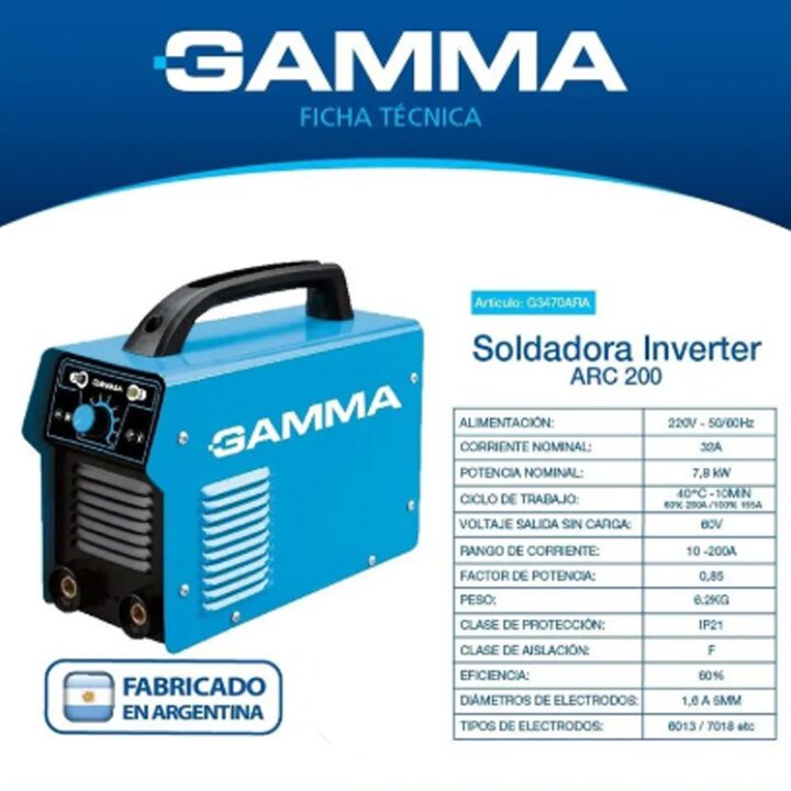 Regulador por sistema inverter, con regulación del amperaje de ajuste fino. Turbo ventilador que asegura una eficaz refrigeración de los rectifiadores. Provista con correa de transporte, cables y pinza por electrodo. Apta para electrodos de 1,6 a 5 mm.